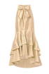 Falda asimétrica larga de talle alto, con doble capa de plisado en el ruedo y cinturón en el mismo material.