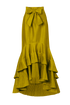 Falda asimétrica larga de talle alto, con doble capa de plisado en el ruedo y cinturón en el mismo material.