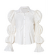 Blusa con cuello americano, botones en nacar y mangas globo con encauchados.